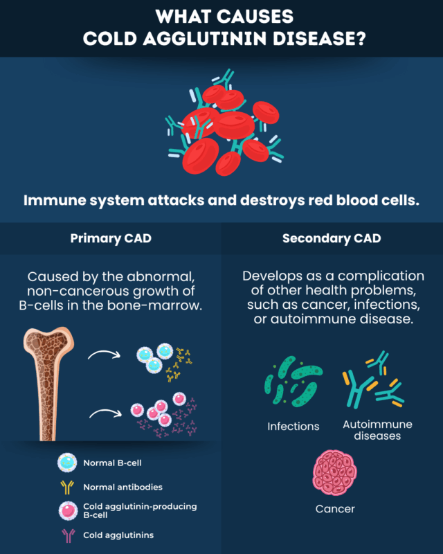 Essentially, it’s thought that primary CAD occurs when B-cells that make cold agglutinins start to grow too much, causing levels of these antibodies to increase to the point that they eventually cause disease.